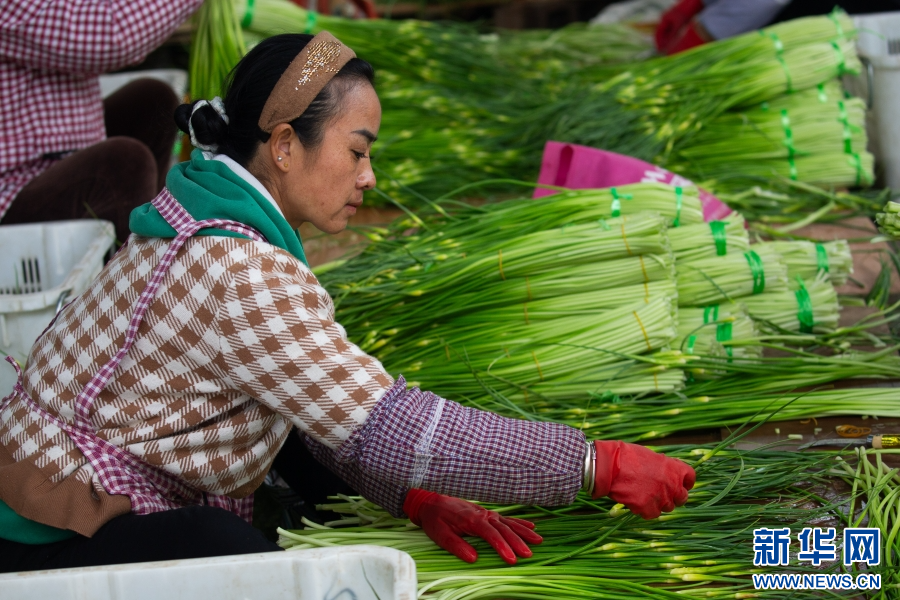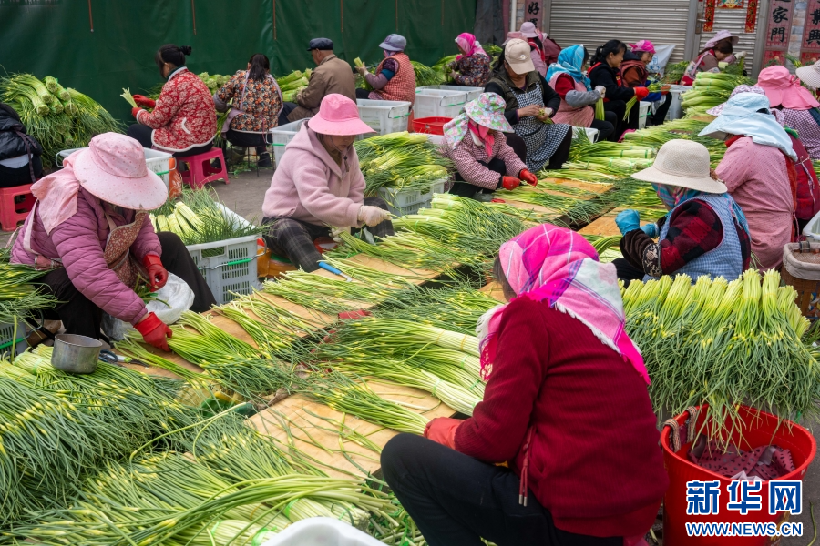 務工人員在越州鎮一處收購點分揀蒜薹(2月16日攝)。新華網發(楊俊鵬 攝)