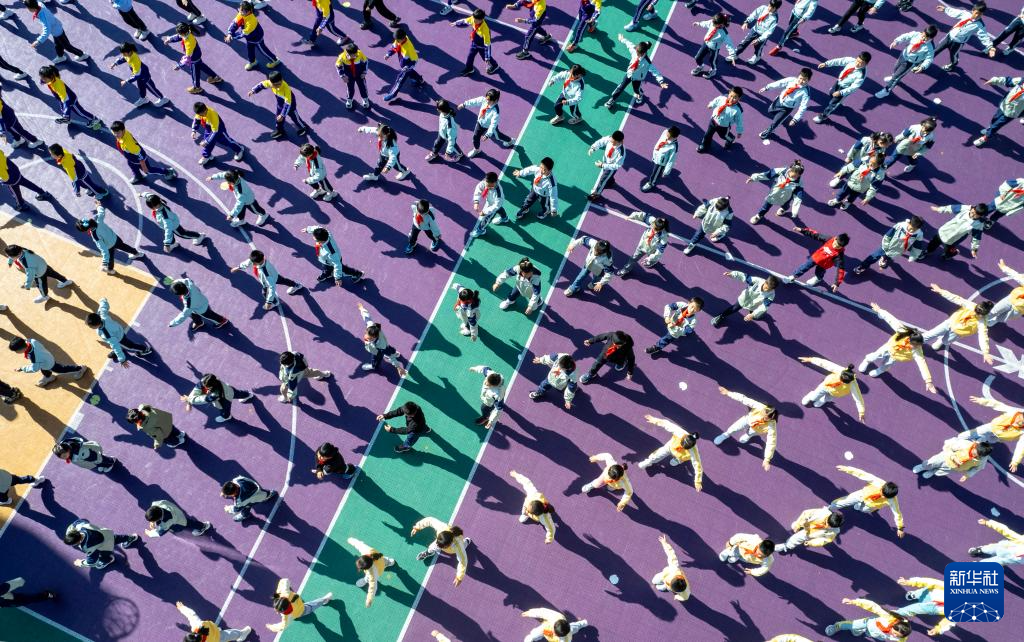 2月28日,昆明市金康園小學學生在操場上做課間操(無人機照片)。新華社記者 陳欣波 攝