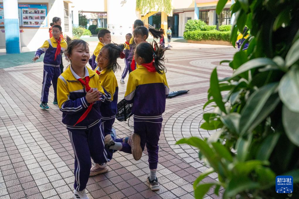 2月28日,昆明市金康園小學學生在校園里做游戲。新華社記者 陳欣波 攝