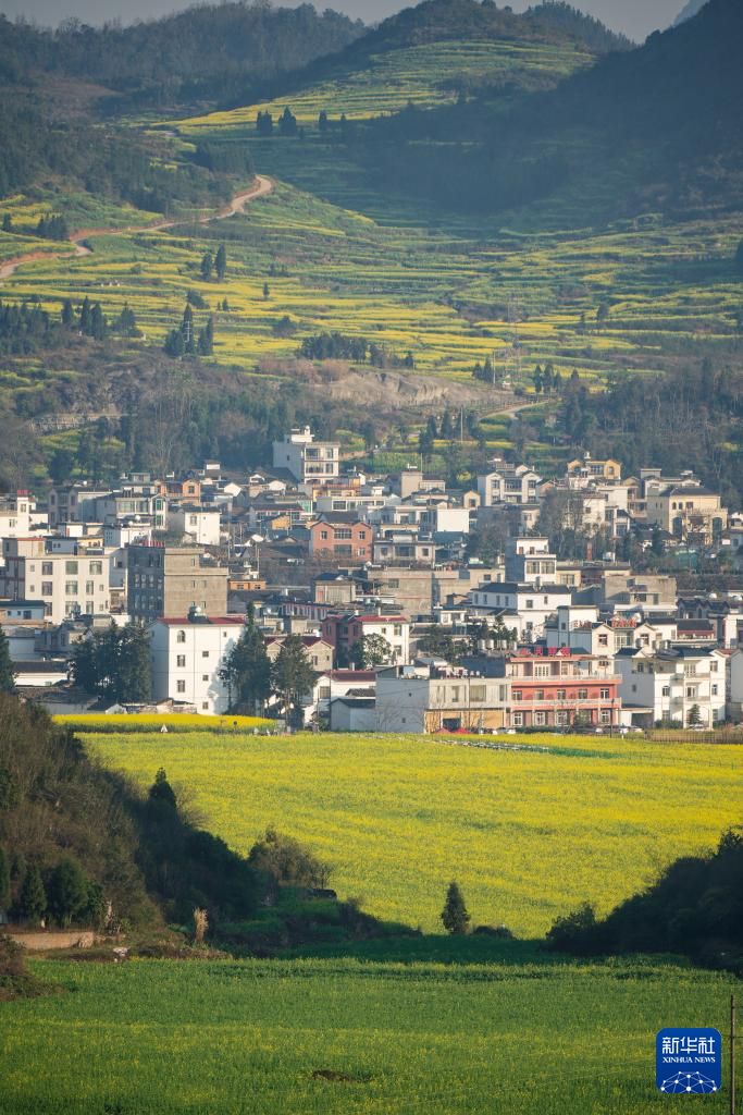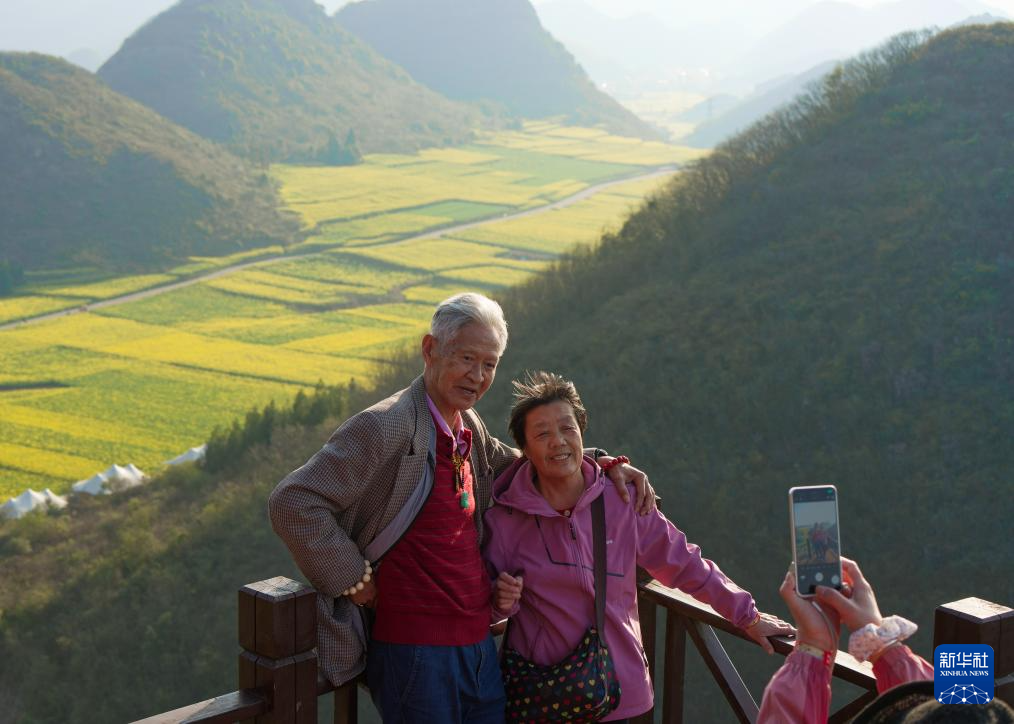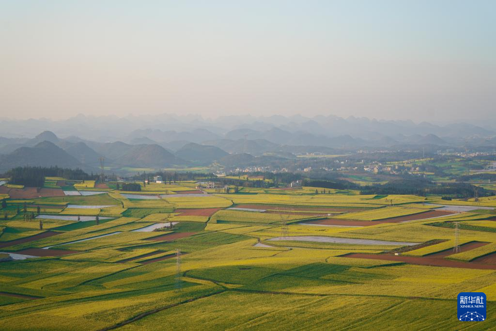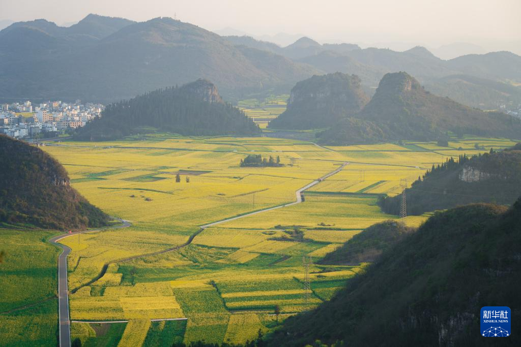 近日,云南省曲靖市羅平縣百萬畝油菜花競相綻放,金黃色的油菜花田與山巒、村莊相互映襯,構成了如詩如畫的田園風光,吸引各地游客前來觀花賞景。