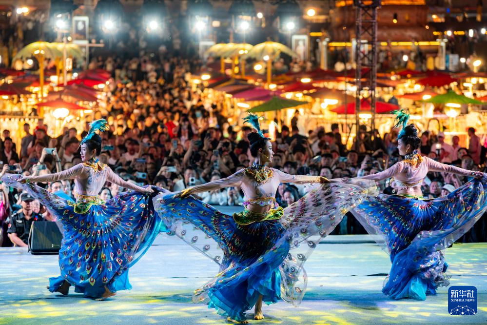 2024年12月7日,游客在位于云南省西雙版納傣族自治州景洪市的告莊西雙景星光夜市觀看歌舞展演。新華社記者 胡超 攝