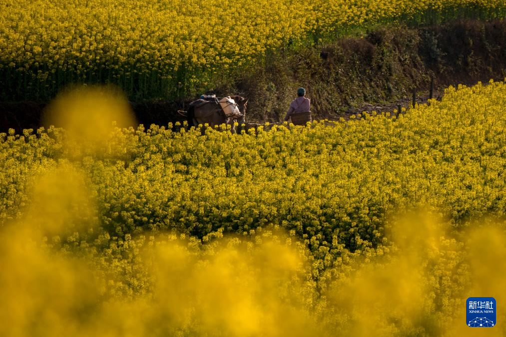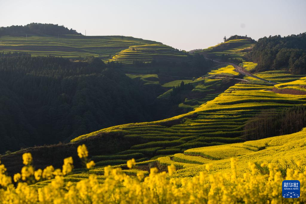 金浪翻涌間,錯落分布的村寨若隱若現,與花海、山巒共同勾勒出一幅田園春景圖,吸引國內外游客紛至沓來,感受春天的氣息。