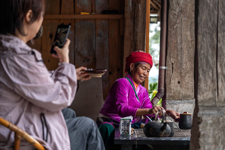 游客在云南省普洱市瀾滄拉祜族自治縣景邁山翁基古寨拍攝布朗族老人制作罐烤奶茶。新華社記者 胡超 攝