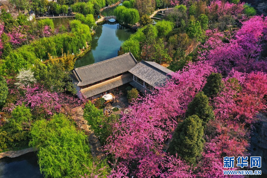 近日,位于昆明市盤龍區的云南豐澤源植物園,春風吹拂,流水潺潺,櫻花綻放,吸引了眾多游客前來觀賞。(滇勇 尹元家)