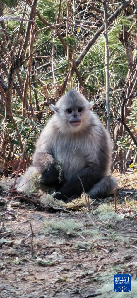 2025年3月10日,在白馬雪山國家級自然保護區響古箐片區,一只滇金絲猴正在吃松蘿。新華社記者 浦超 攝