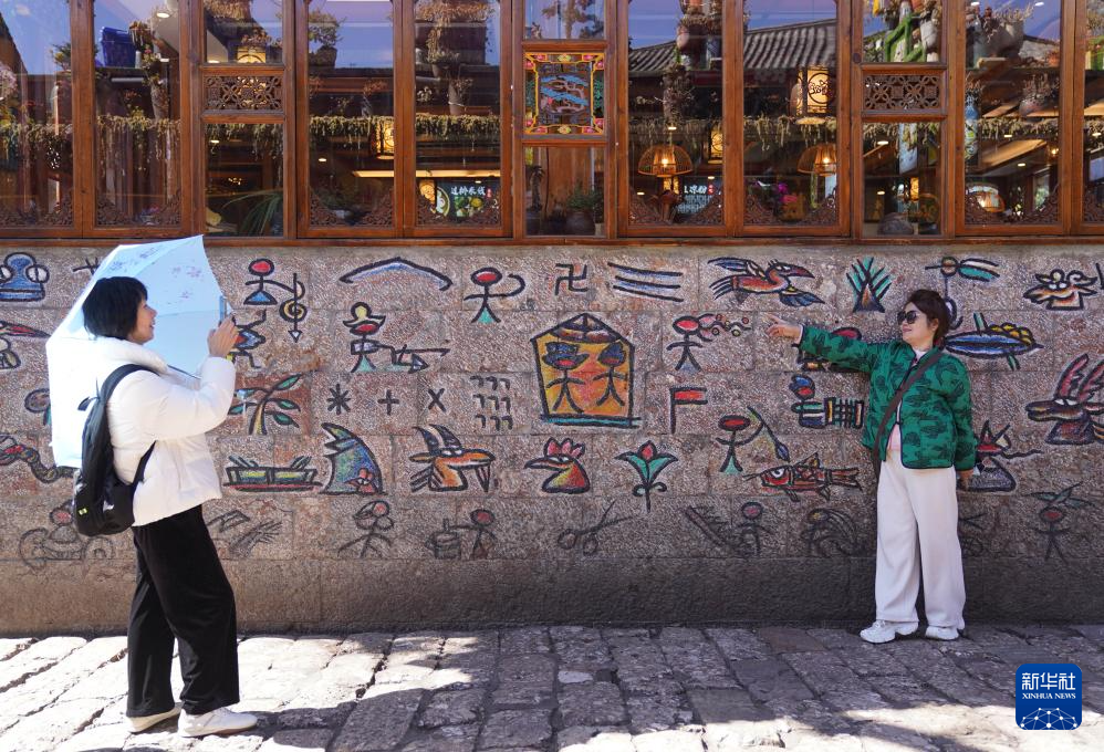 3月25日,游客在云南省麗江市麗江古城東巴文字墻前拍照。