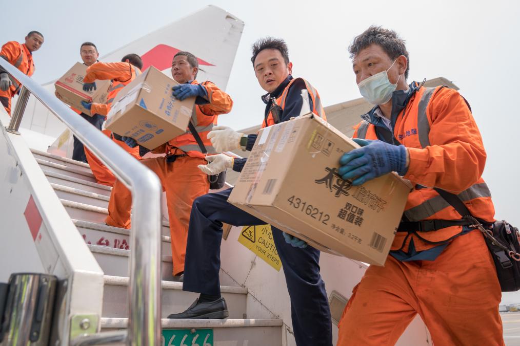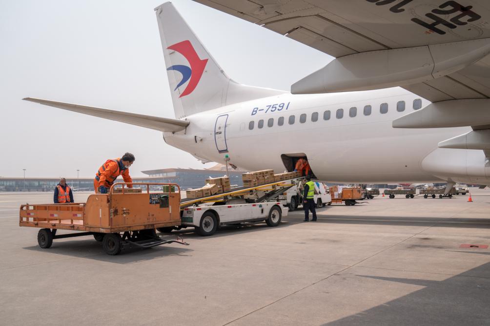 3月30日,在昆明長水國際機場,工作人員往飛機上運送救援物資。新華社發(彭奕凱 攝)