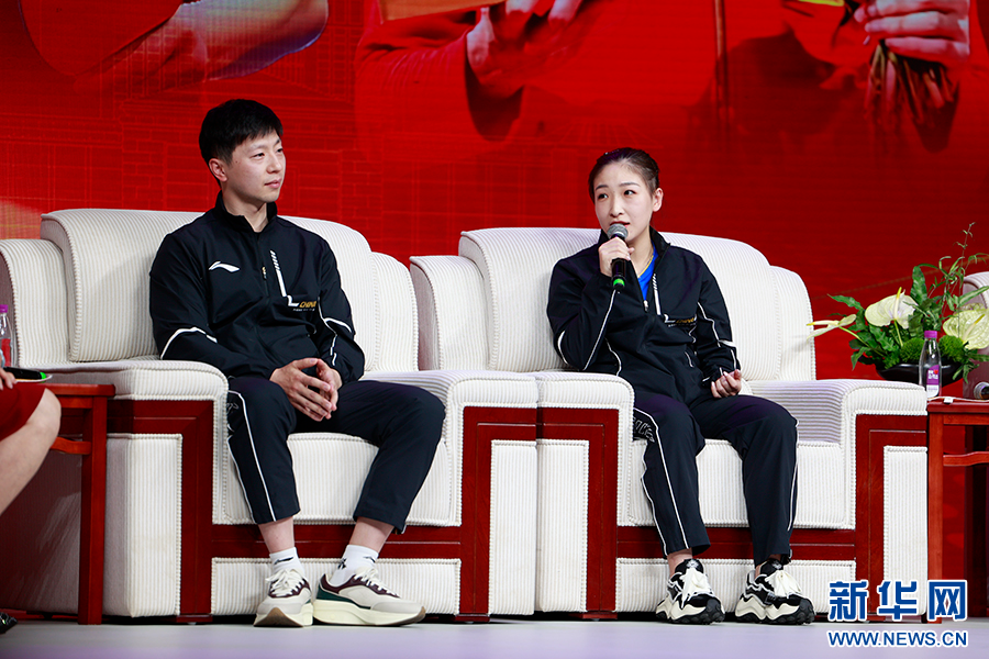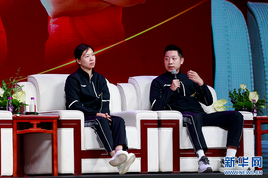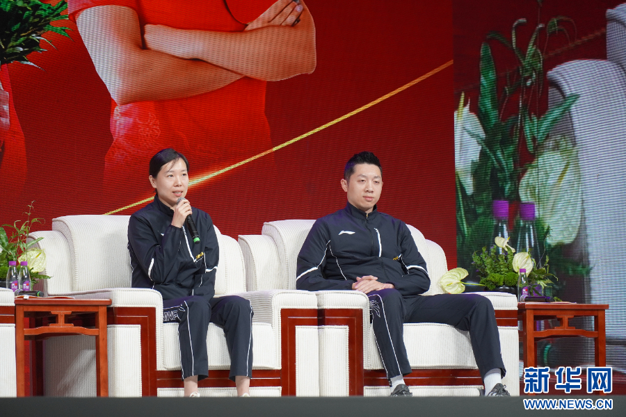 許昕(右)作分享交流(4月8日攝)。新華網發(徐華陵 攝)