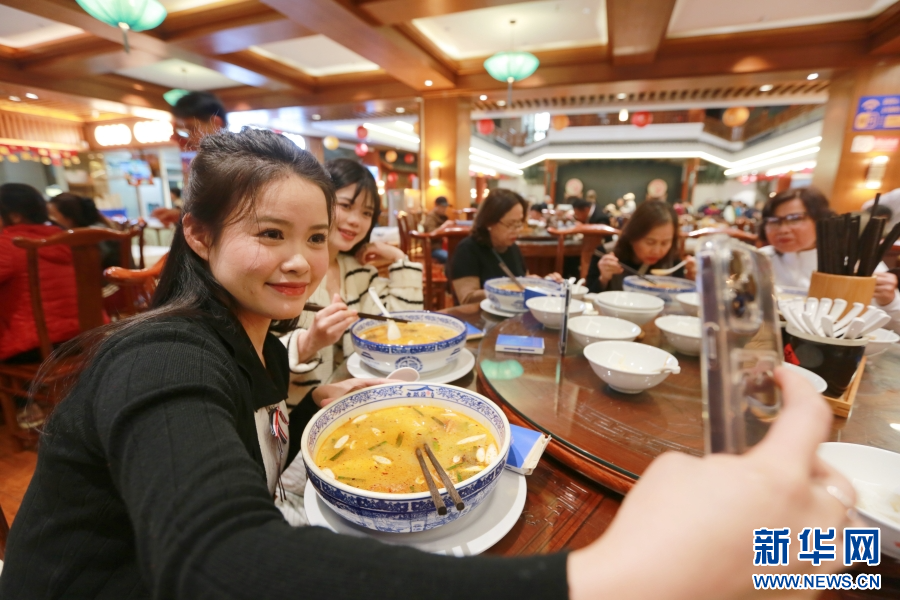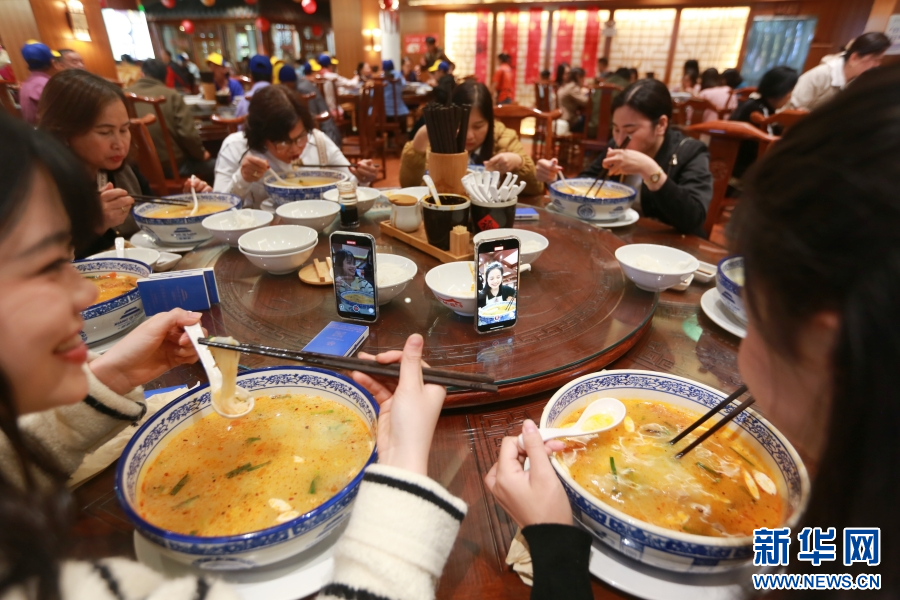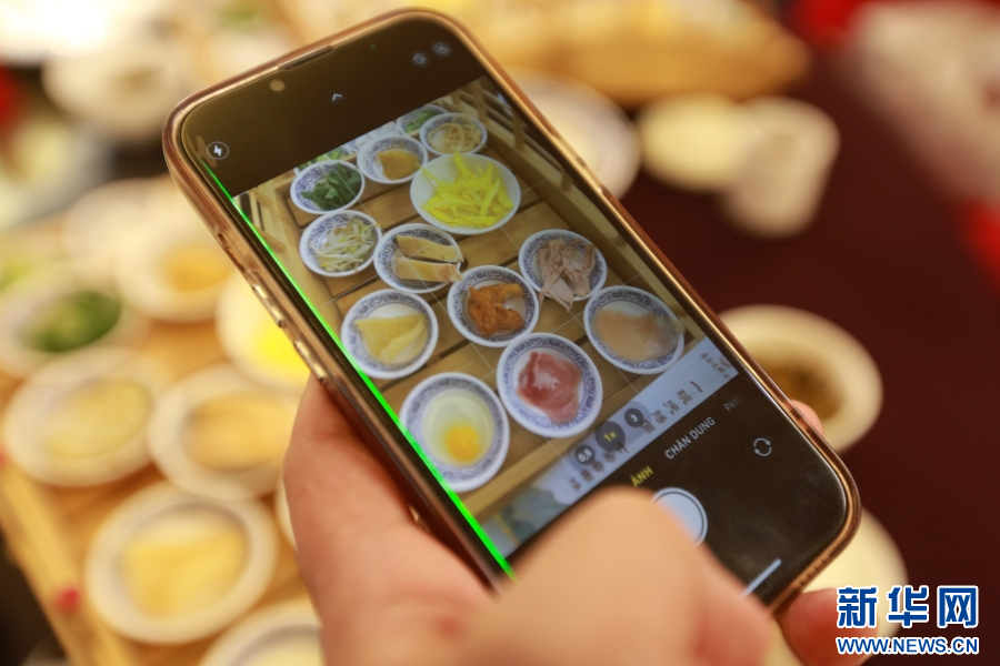 越南游客在云南省蒙自市一家過橋米線店品嘗過橋米線,拍照、錄制視頻“打卡”(4月13日攝)。新華網發(薛瑩瑩 攝)