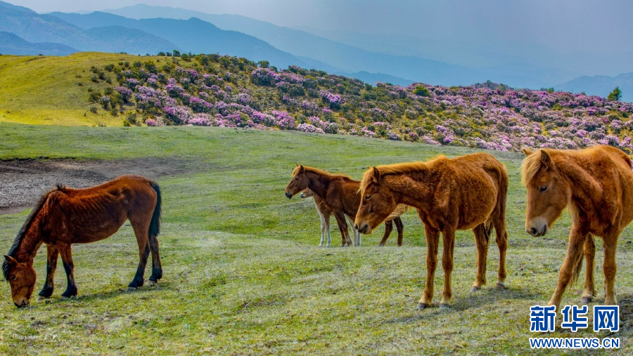 馬兒與遠處的杜鵑花相映成趣(4月20日攝)。新華網發(段相如 攝)