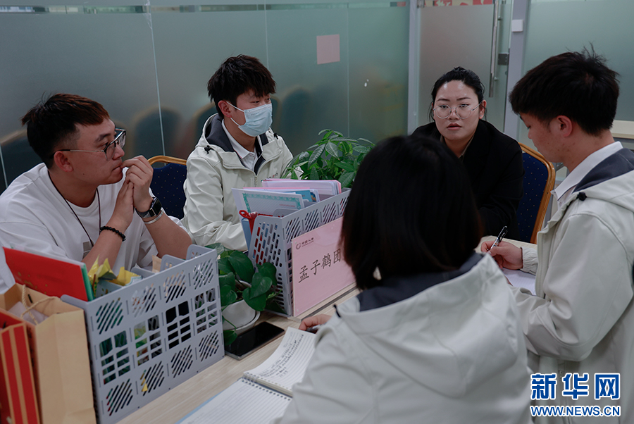 孟子鶴(左)與客戶溝通交流(4月17日攝)。新華網發(宋瑞成 攝)