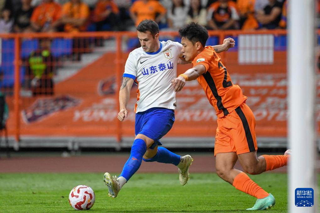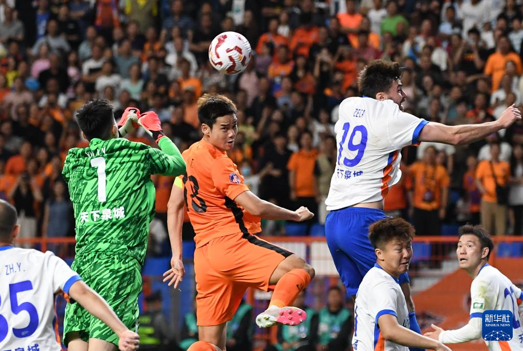5月5日,山東泰山隊守門員于金永(右)在比賽中撲救。新華社發(彭奕凱 攝)
