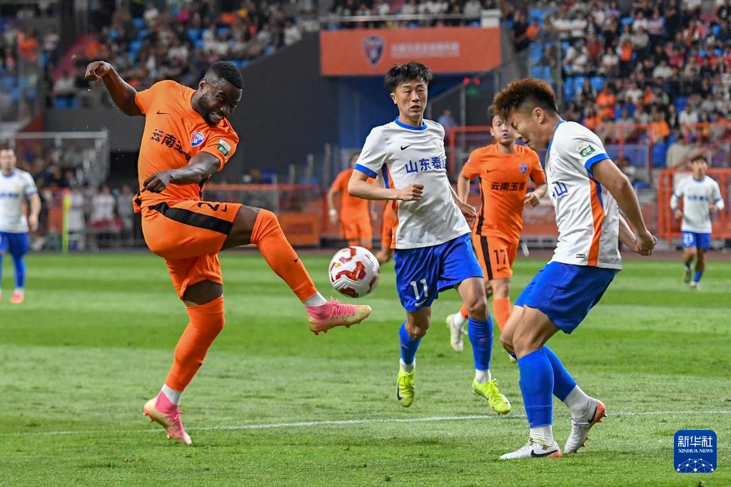5月5日,山東泰山隊球員卡扎伊什維利(左)在比賽中與云南玉昆隊球員張宸梁拼搶。新華社發(彭奕凱 攝)