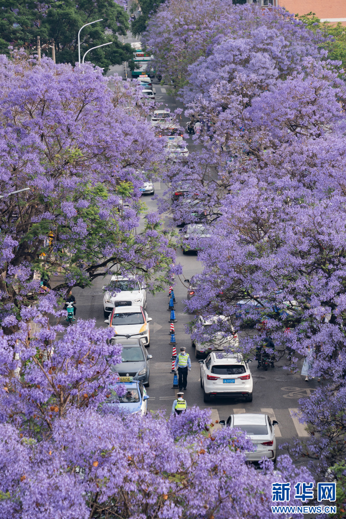 藍花楹樹下的車流及指揮交通的交警(5月1日攝)。新華網發(鄭益 攝)
