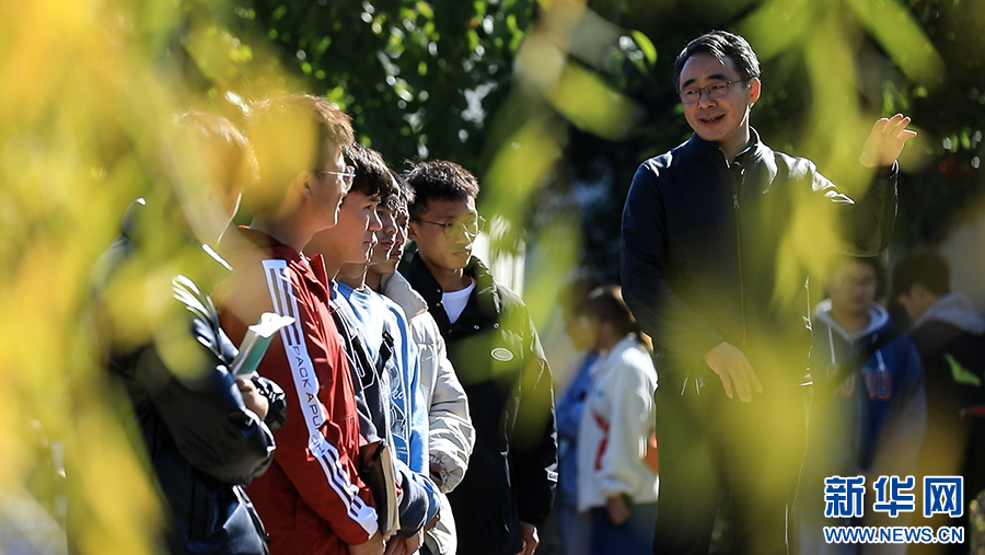 校園內,老師帶領學生在大壩旁學習理論課(2022年11月24日攝)。新華網發(徐華陵 攝)