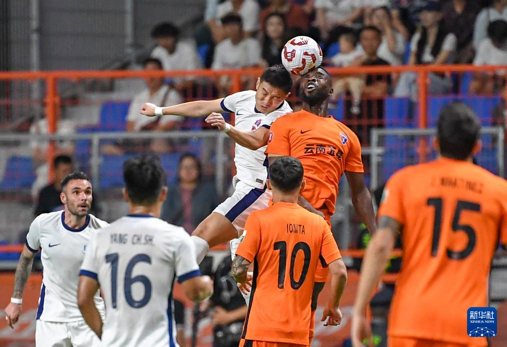 5月16日,云南玉昆隊球員奧斯卡(上右)在比賽中爭頂。新華社發(彭奕凱 攝)
