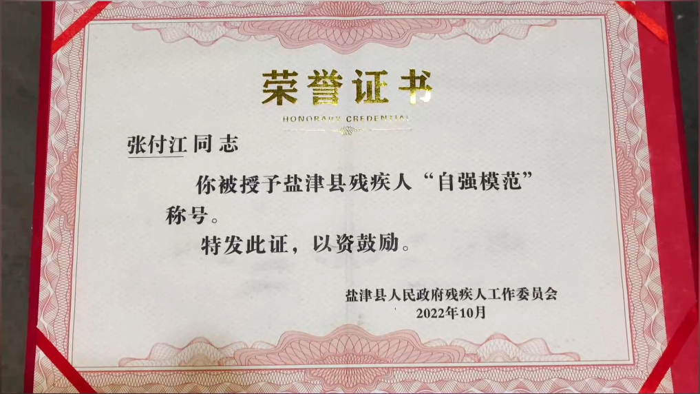 17歲開始外出務工,擺地攤、賣水果,用雙手養活自己。19歲回鄉后,他從養雞養豬起步,用爬行的身軀喂養牲畜,單手開著三輪車往返各個鄉鎮集市。最困難的時候,張付江每天只睡3個小時。正是這份堅持,讓他從最初的幾十只雞發展到500多只雞、200多頭生豬,并成立了張付江養豬專業合作社。不甘于現狀的他開始自學電商,通過網絡把家鄉的天麻、土雞、臘肉等特產銷往全國,并帶動了5名殘障朋友一起就業創業。獲得了“鹽津縣自強模范”“殘疾人創業示范戶”等榮譽。