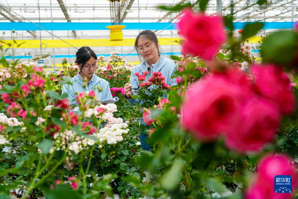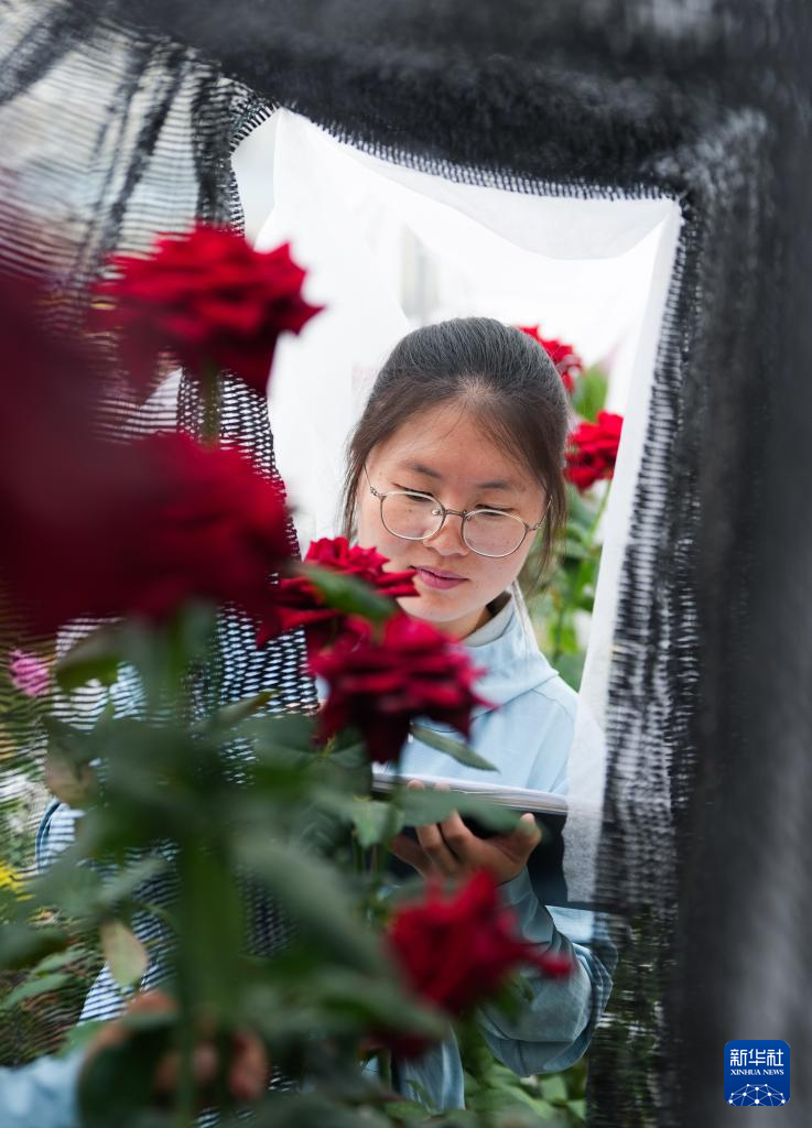 5月18日,昆明斗南國際花卉技術創新中心工作人員在查看并記錄月季新品種生長情況。新華社記者 陳欣波 攝