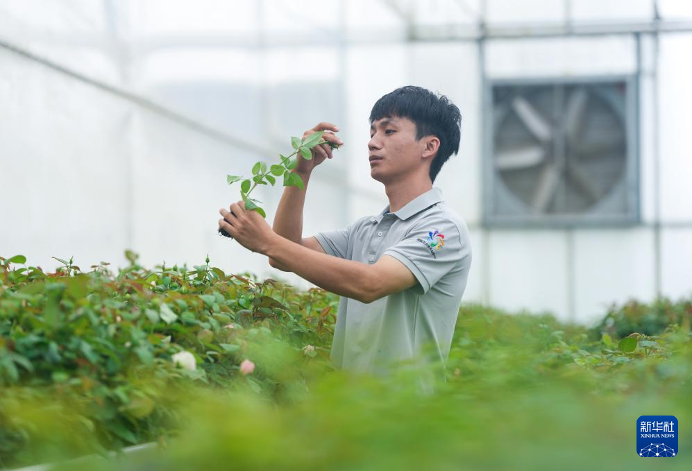 5月18日,昆明斗南國際花卉技術創新中心工作人員在查看月季新品種種苗生長情況。新華社記者 陳欣波 攝
