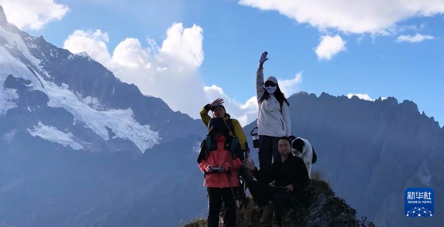 邊瑪永宗在徒步過程中和游客合影。新華社發