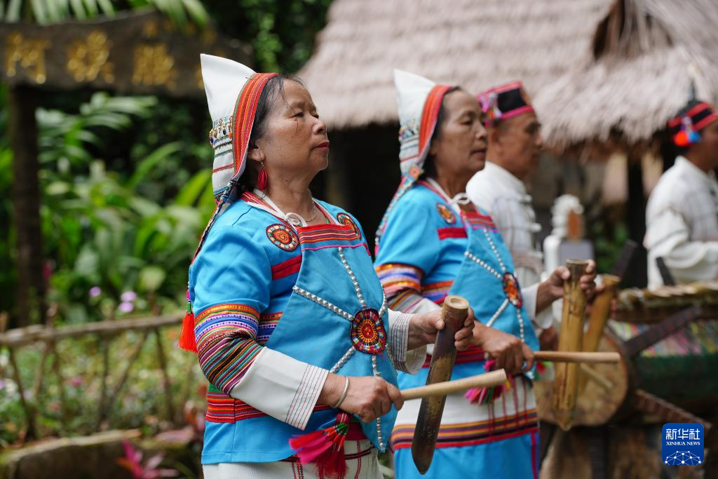 5月16日,演員在基諾山寨景區表演基諾族民間音樂“奇科阿咪”。新華社記者 高詠薇 攝