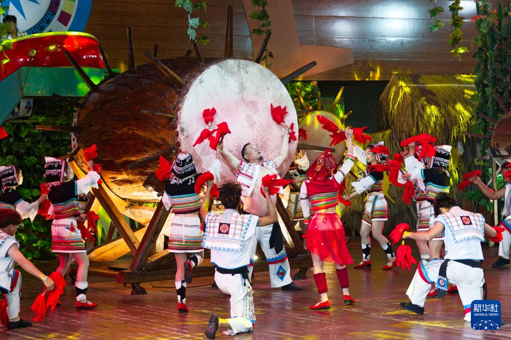 5月16日,演員在基諾山寨景區表演基諾大鼓舞。2006年,基諾大鼓舞被列入第一批國家級非物質文化遺產名錄。新華社記者 高詠薇 攝