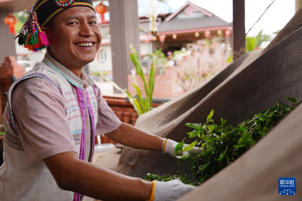 5月17日,景洪市基諾山基諾族鄉巴坡村村民子布魯在家門口曬茶。新華社記者 高詠薇 攝