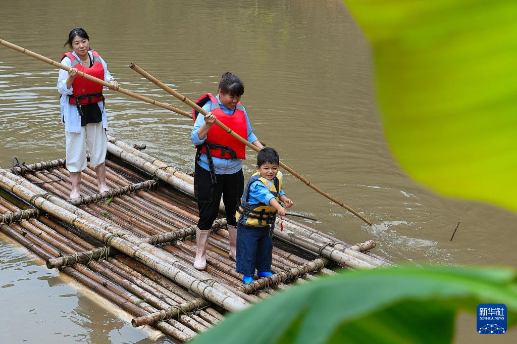 5月17日,在景洪市基諾山基諾族鄉,游客在雨林徒步項目體驗竹筏劃船。新華社記者 高詠薇 攝