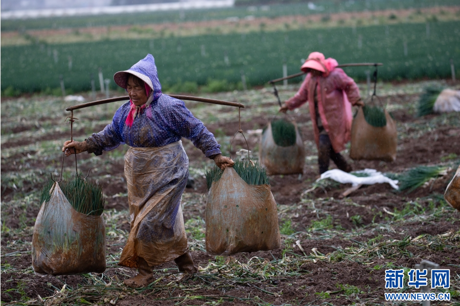 云南省曲靖市麒麟區越州鎮,村民將香蔥裝袋。新華網發(楊俊鵬 攝)