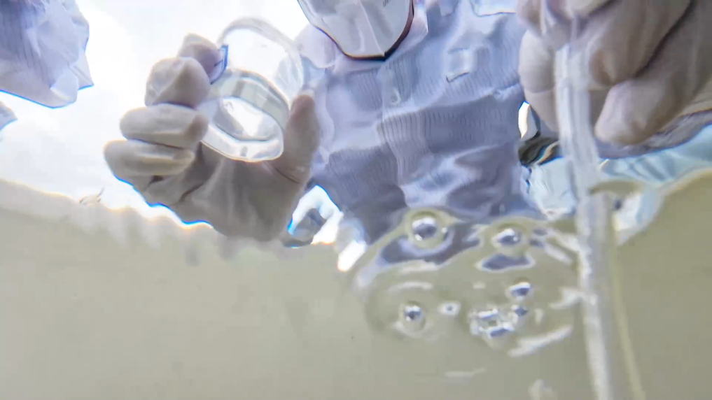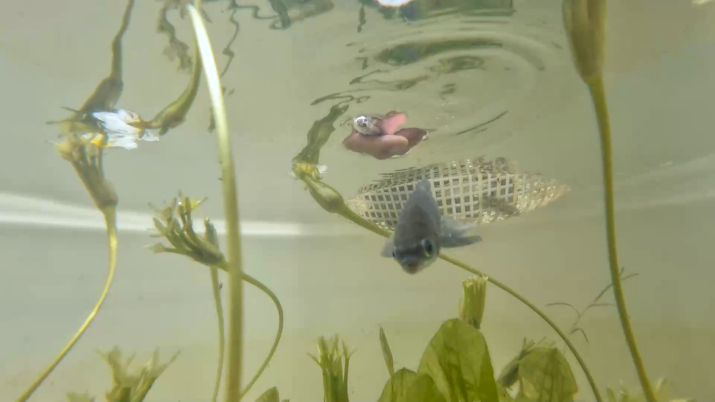 在右所鎮永安海菜種植區,剛投放的鰱魚游向海菜田深處,這是生物調控技術的新應用。