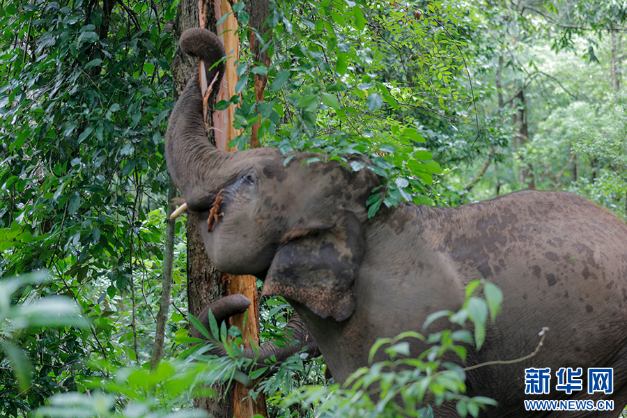 亞洲象用鼻子撕扯食用樹皮(2023年7月15日攝)。新華網發(徐華陵 攝)