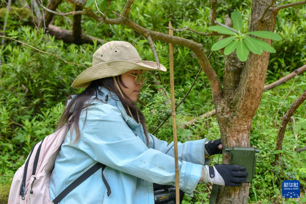 6月15日,西華師范大學研究生在保護區內安裝用于記錄聲音的鳴聲記錄儀。新華社發(彭奕凱 攝)