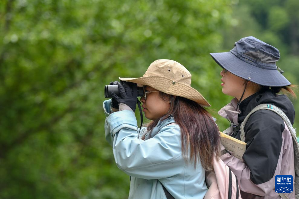 6月15日,西華師范大學研究生使用望遠鏡觀測滇金絲猴。新華社發(彭奕凱 攝)