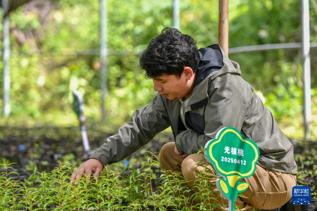 6月15日,保護區工作人員在救助站內查看滇金絲猴食源性植物育苗生長狀況。新華社發(彭奕凱 攝)
