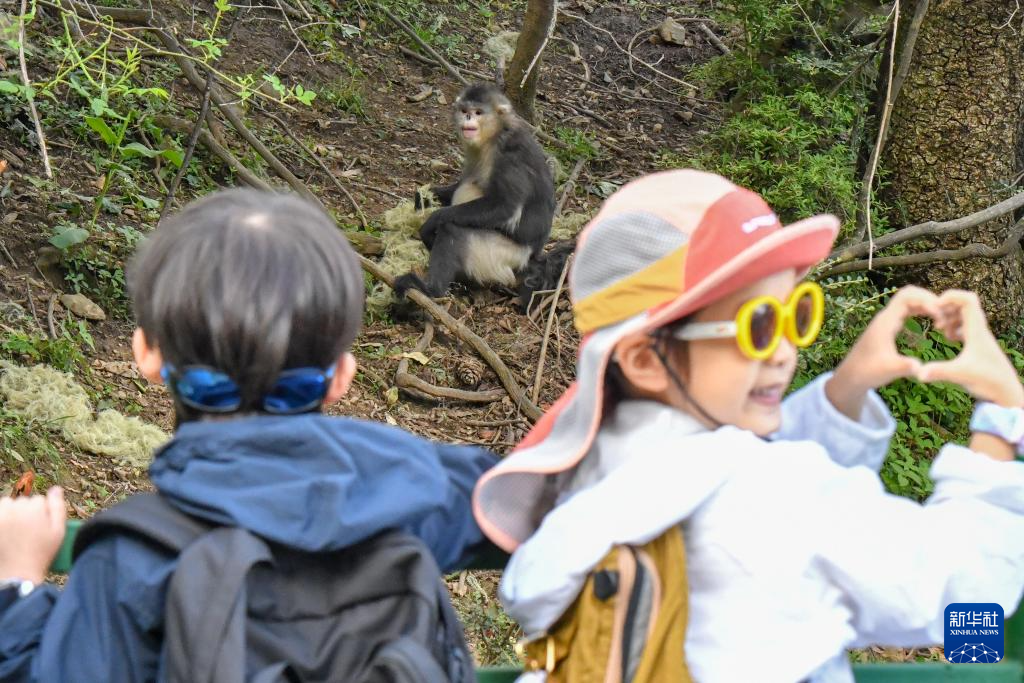 6月15日,游客在白馬雪山國家級自然保護區與滇金絲猴合影。新華社發(彭奕凱 攝)
