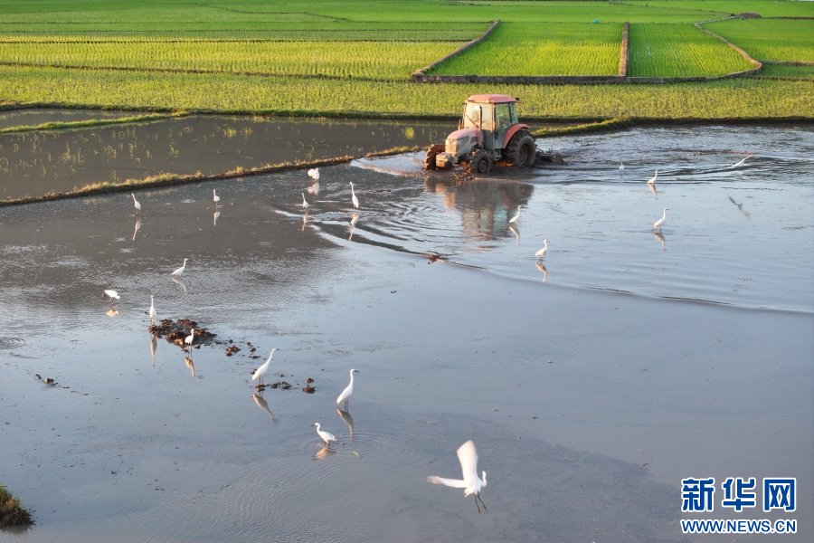 云南省騰沖市和順鎮,農機忙碌,白鷺翩躚(6月15日攝)。新華網發(龔祖金 攝)
