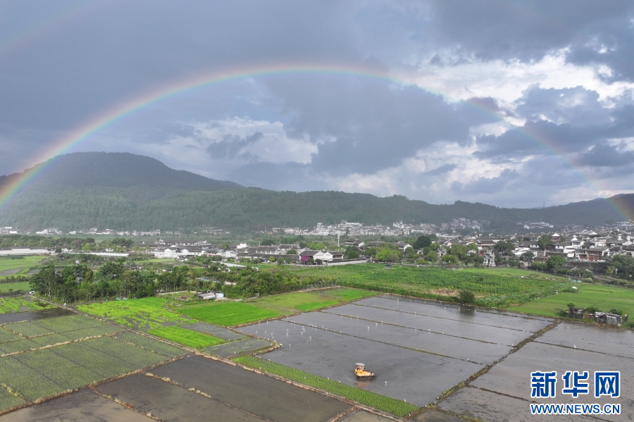 彩虹下的云南省騰沖市和順鎮田園風光(6月15日攝)。新華網發 (龔祖金 攝)