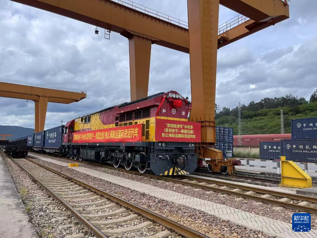“昆明陸港號”鐵公海聯運國際貨運列車從昆明國際陸港安寧北港桃花村貨運站啟程,通過中老鐵路以公鐵聯運方式經泰國拉廊港,海運至緬甸仰光,全程預計用時10天,相比傳統海運時間縮短了15天。