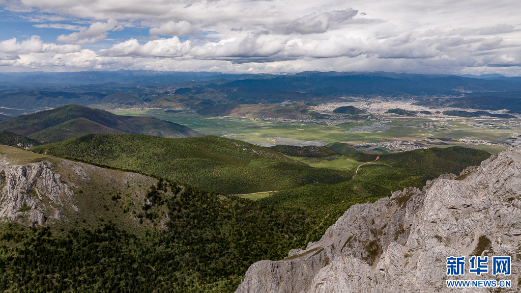 石卡雪山與遠處的納帕海、香格里拉市區(6月10日攝)。新華網發(劉東 攝)