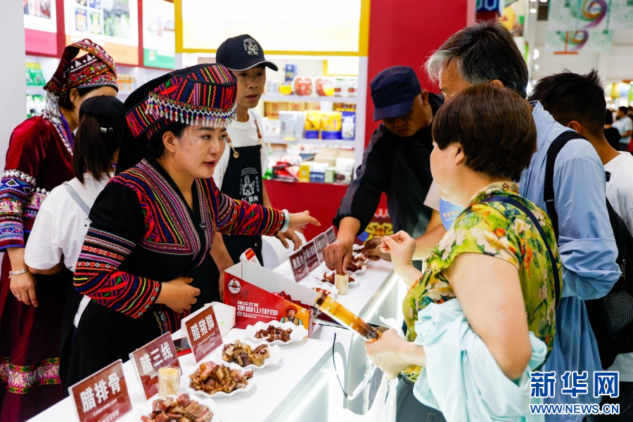 參觀者試吃麻栗坡臘肉(6月19日攝)。新華網發(劉云 攝)