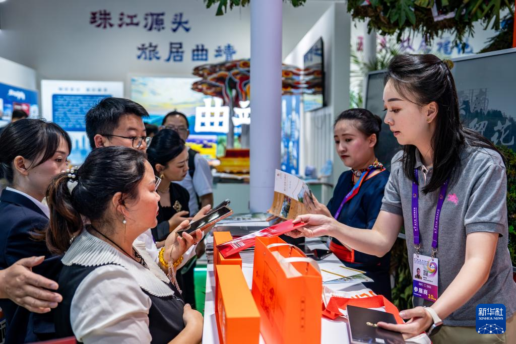 6月20日,參展商在第9屆中國—南亞博覽會旅居云南館推介文旅產品。新華社記者 胡超 攝