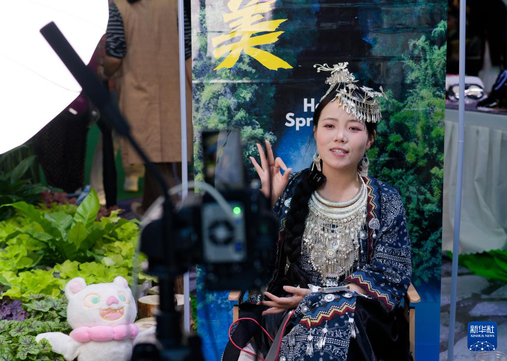 6月20日,一名參展商在第9屆中國—南亞博覽會旅居云南館直播介紹文山壩美特色旅游產品。新華社記者 高詠薇 攝