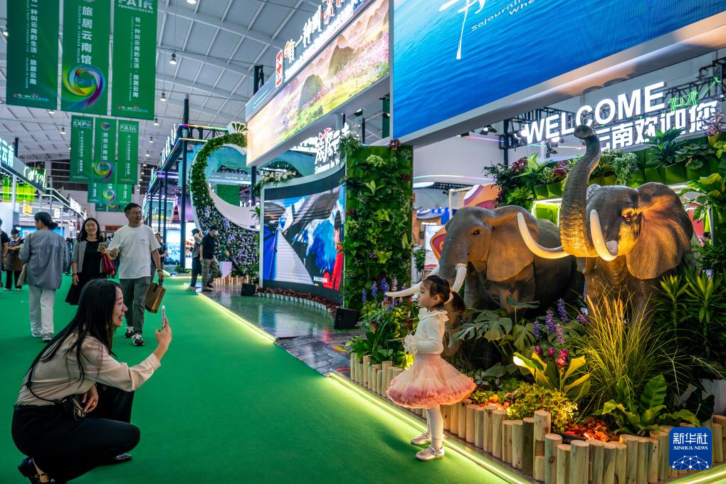 6月20日,觀眾在第9屆中國—南亞博覽會旅居云南館給孩子拍照留念。新華社記者 胡超 攝