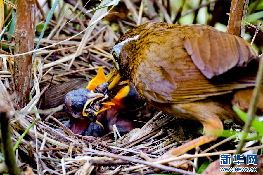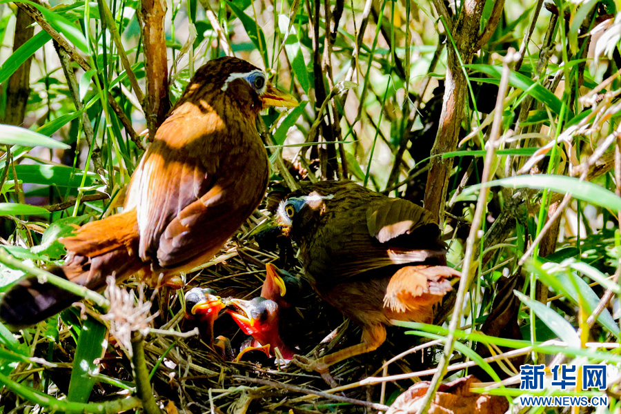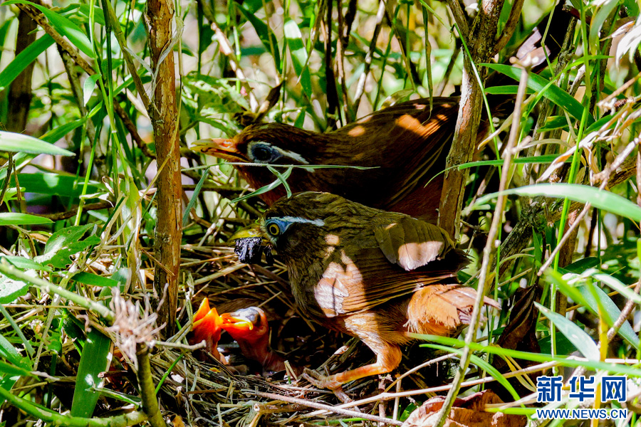 畫眉鳥“夫婦”守護雛鳥進食(6月21日攝)。新華網發(張天祥 攝)