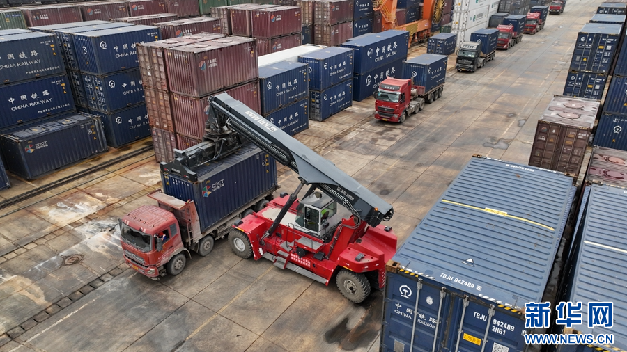 騰俊國際陸港多式聯運公鐵物流中心,工作人員進行裝箱作業(攝于7月4日)。新華網發(劉云 攝)