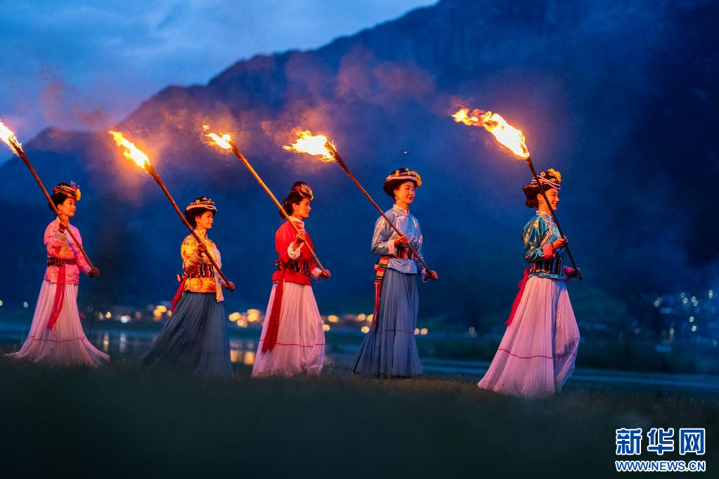 7月4日,寧蒗縣各族群眾共同點燃火把。