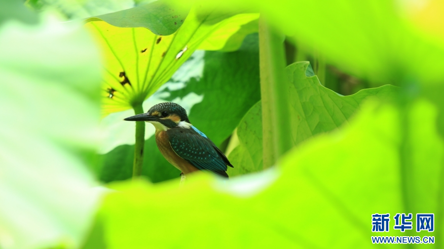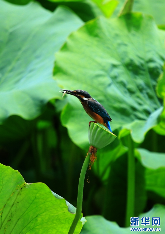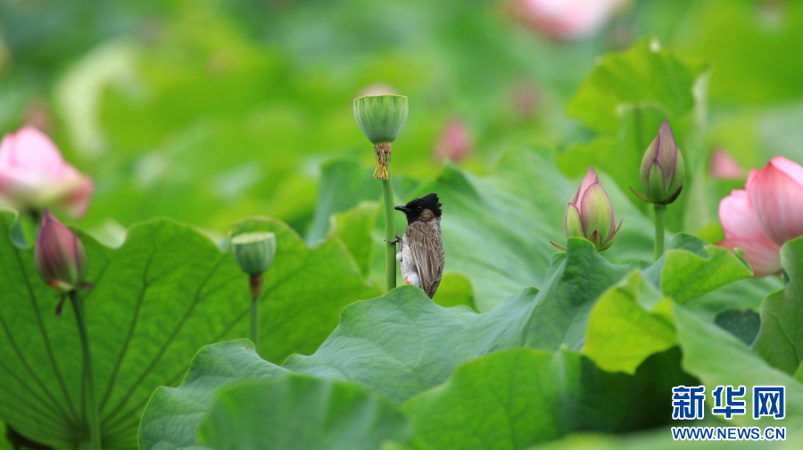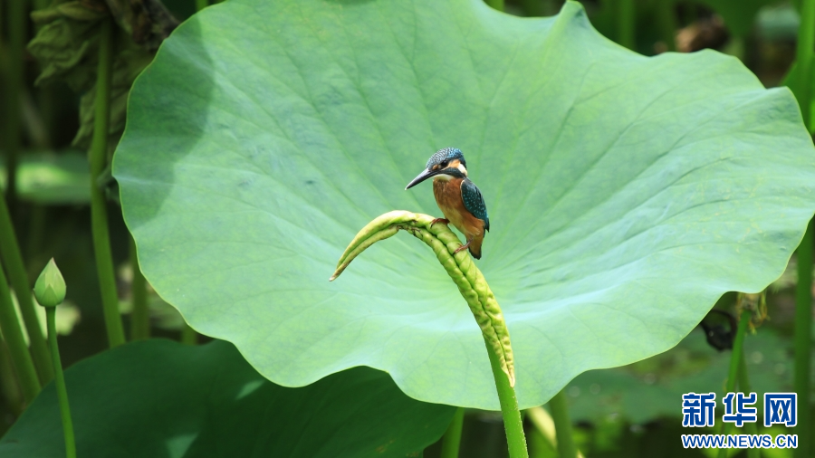 云南省騰沖市和順鎮大莊村的荷塘中,鳥兒在其間穿梭,偶爾停留(7月4日攝)。新華網發(趙輝 攝)