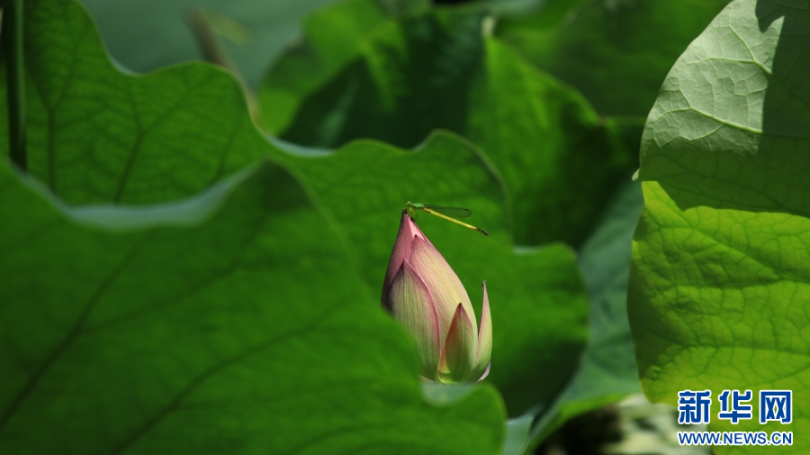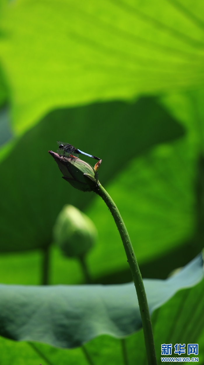 云南省騰沖市和順鎮大莊村的荷塘中,蜻蜓駐足(7月4日攝)。新華網發(趙輝 攝)