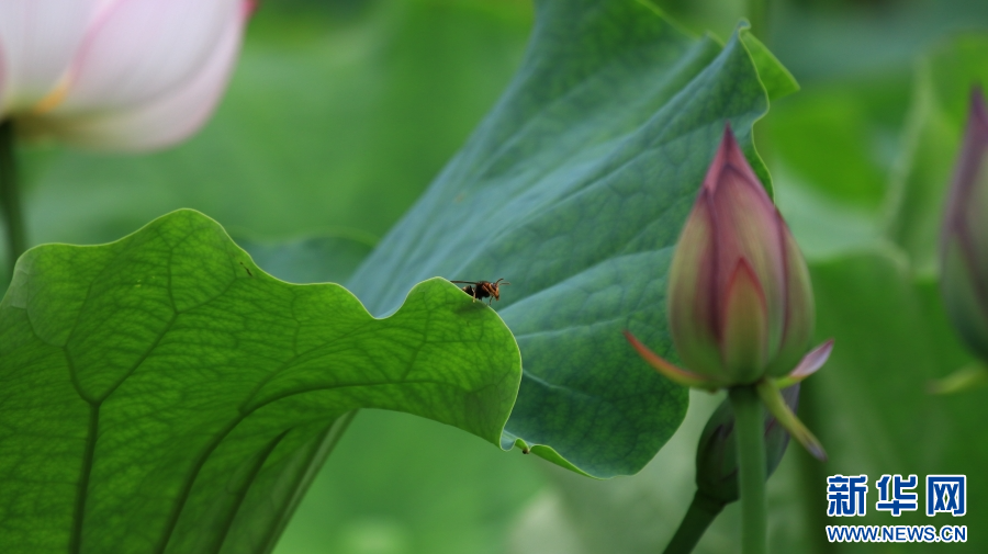 云南省騰沖市和順鎮大莊村的荷塘中,胡蜂停駐在荷葉上(7月4日攝)。新華網發(趙輝 攝)