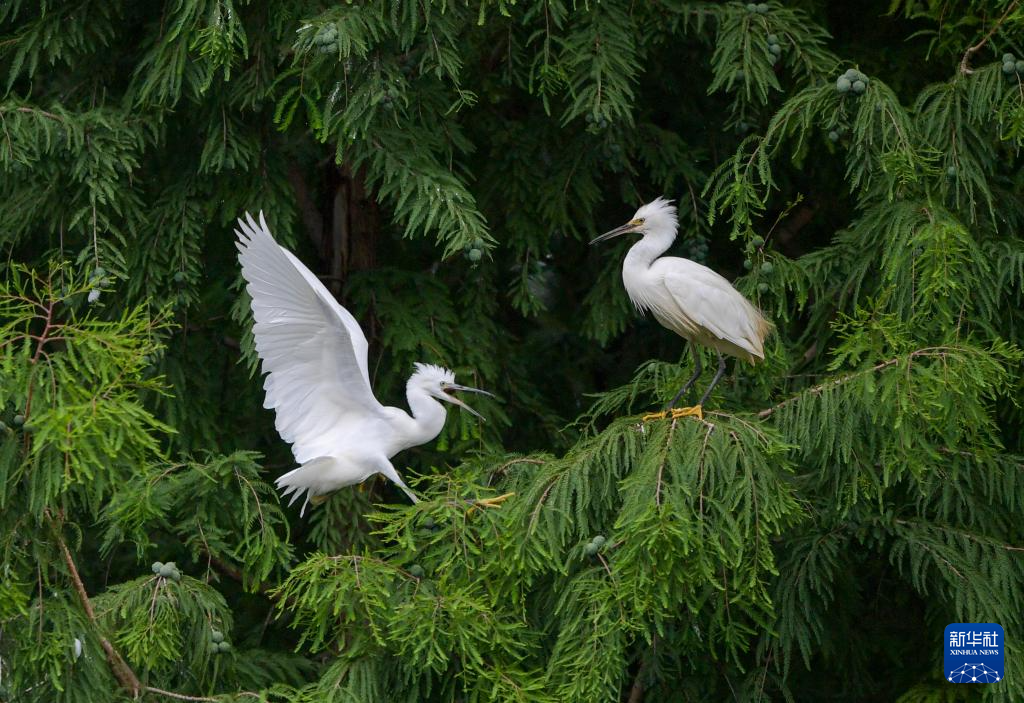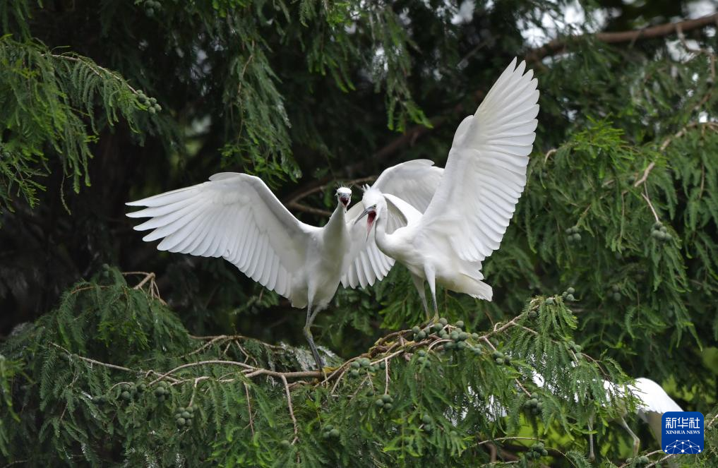 7月7日,兩只白鷺在昆明滇池海洪濕地公園嬉戲。新華社記者 陳欣波 攝